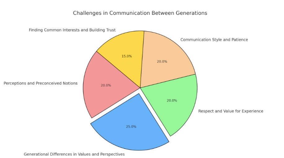 Top Challenges (each with 27% frequency): Generational differences, respect for experience, and communication style were highlighted most frequently. These themes suggest that individuals find both generational values and differing communication preferences to be significant barriers. Moderate Challenges (each with 18% frequency): Perceptions and stereotypes, finding common interests, and adaptability in communication were mentioned somewhat less but remain essential for smooth communication.
