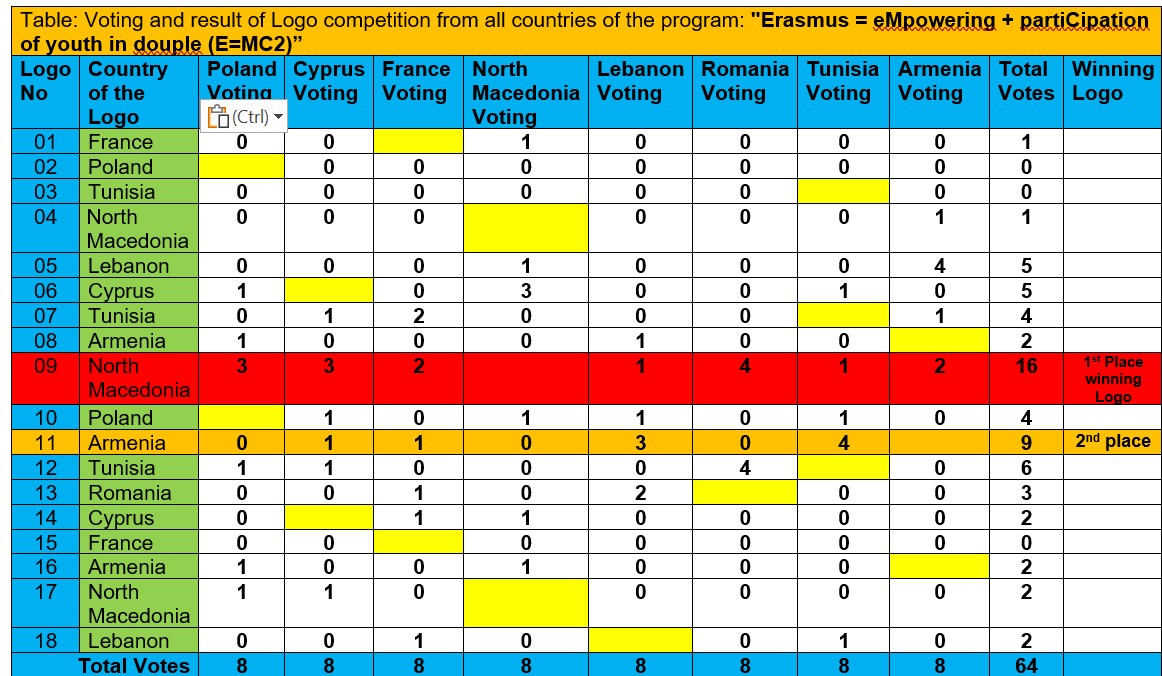 Period from 5th till 15th of July 2024 was the voting from all participants of the project has been done and the results was sent to the coordinator (received all the results till 15th of July) who concentrate them to the following Table.